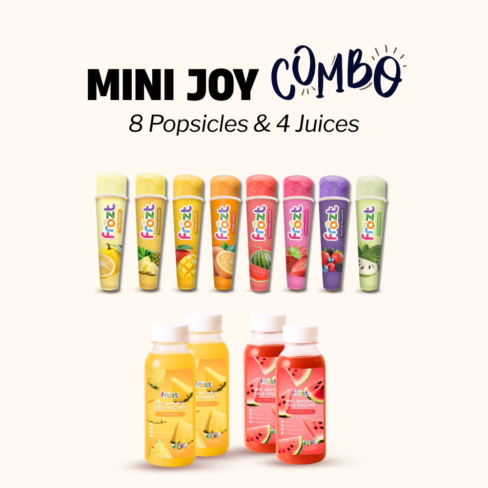 Your perfect starter pack of Frozt. A little bit of everything — 4 bottles of frozen cold-pressed juice and 8 assorted popsicles made with real fruits.